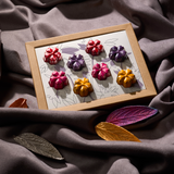 There are eight flowers, two of each flavour: purple is Blueberries and Yoghurt, red is Wine, yellow is Banana, pink is Rose.