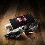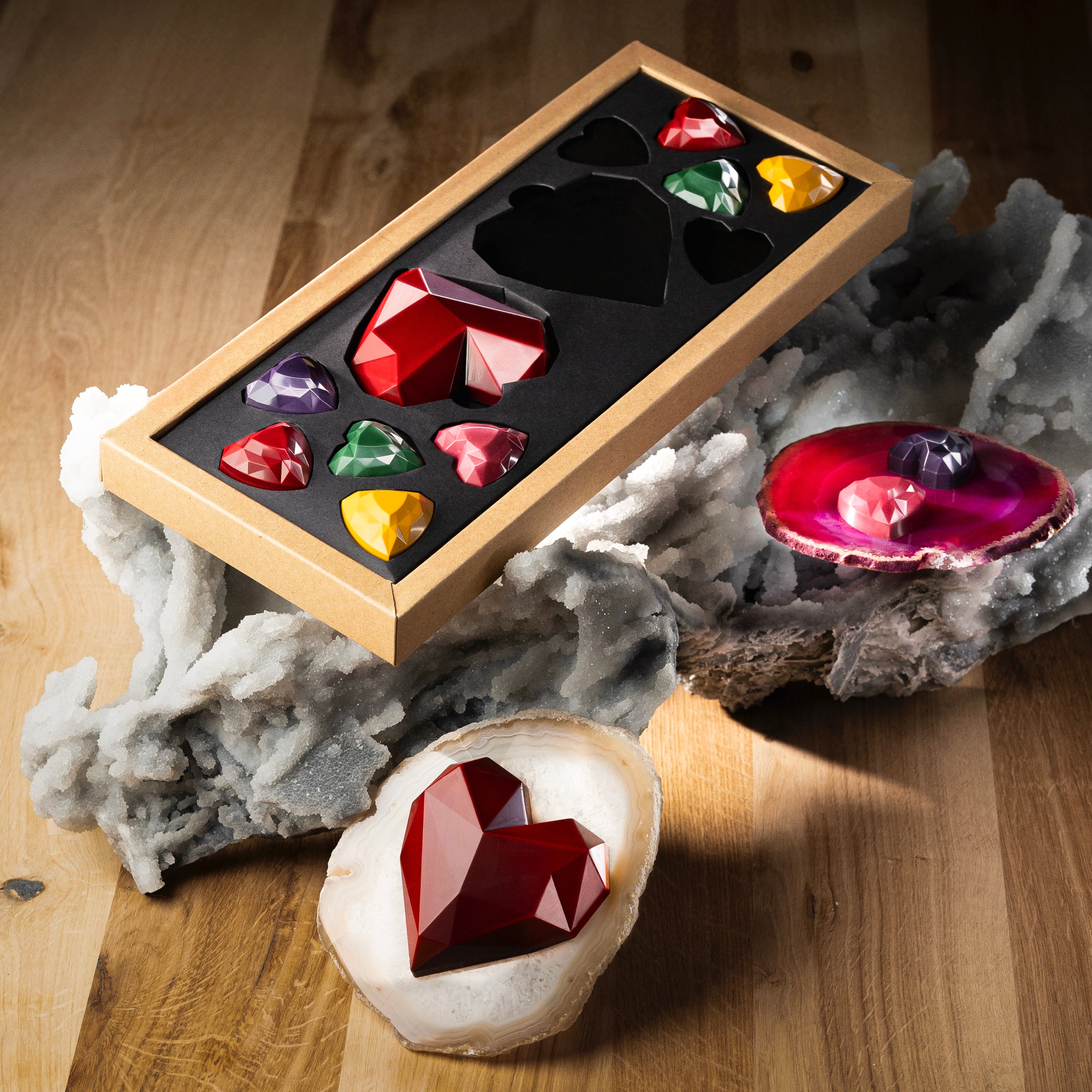 Anyway, we're here to love, not hate. This box has two big hearts with tonka beans caramel, a bergamot ganache, and а hazelnut gianduja. Right next to the two are ten little hearts:
